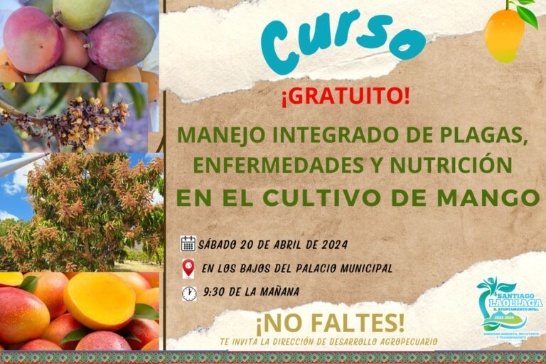 El H. Ayuntamiento Municipal Constitucional, en coordinación con la Dirección de Desarrollo Agropecuario, hacen una cordial invitación a todos los productores de mango de nuestra población y al público en general, para que el día 20 de abril asistan al curso, en el que aprenderán técnicas para mejorar la calidad y la producción de sus huertas.
