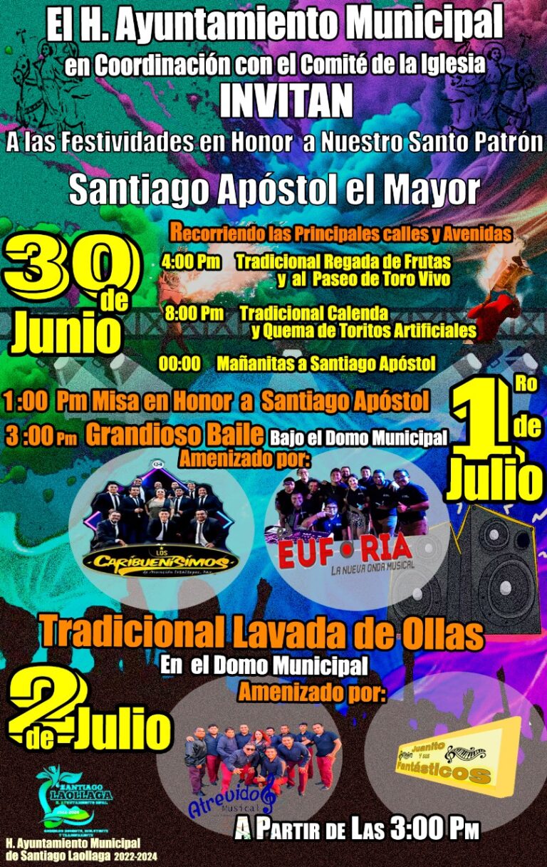 El H. Ayuntamiento Municipal en coordinación con el comité de la Iglesia, invita a toda la población y a los habitantes de los municipios circunvecinos, para asistir y disfrutar de nuestras festividades de entrada de mes. Como cada año, en nuestra población se organizan una serie de eventos para festejar a nuestro Santo Patrón «Santiago Apóstol el Mayor».