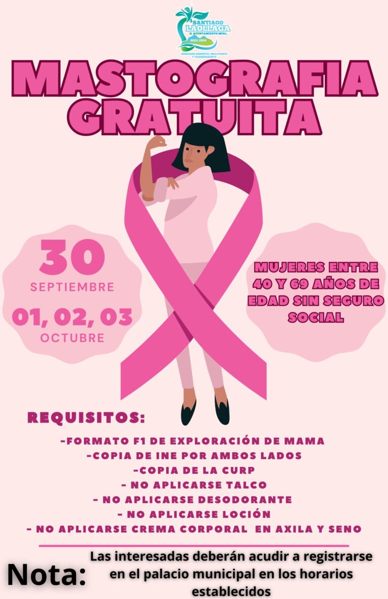 El H. Ayuntamiento y la Regiduría de Salud, con el propósito de fortalecer la salud y el bienestar de nuestra población. Convocan a todas las mujeres de nuestro municipio, a participar y acudir a nuestra campaña de MASTOGRAFÍA GRATUITA.