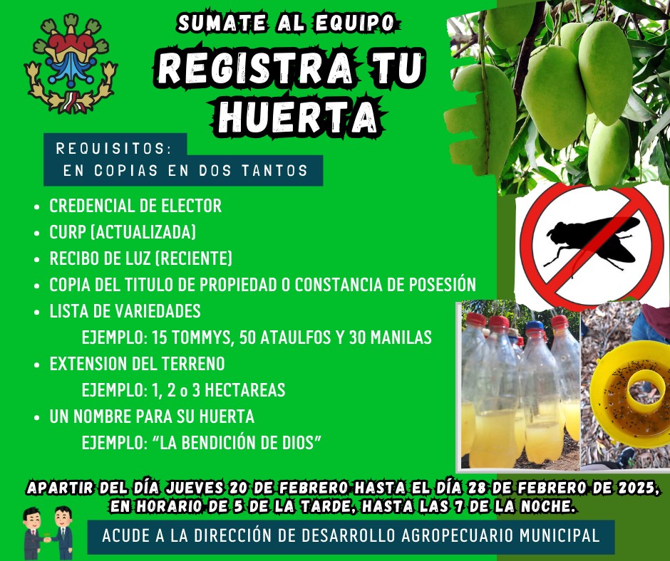 Hacen una atenta invitación a todos los productores de mango de nuestra población, que estén interesados en registrar de sus huertas. Los interesados deberán acudir a la oficina de la Dirección de Desarrollo Agropecuario de este Municipio, a partir del día jueves 20 de febrero, hasta el día viernes 28 de febrero, en un horario de 5 de la tarde a 7 de la noche, para entregar la documentación mencionada en la imagen, en dos tantos. (Copia).
